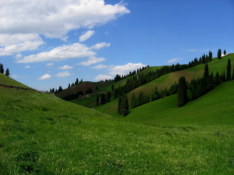 米尔其克草原,是国家AAA级景区,北部山峦叠嶂,云雾缭绕,阴坡森林茂密,是马鹿、狗熊、黄羊、野猪、雪豹、狼、雪鸡等野生动物理想的栖息地。山前草原平坦广阔,夏季炊烟渺渺,牛羊遍野,奶茶飘香,蓝天白云,松翠柏绿,碧草如茵,繁花似锦。南有隋唐时期突厥石人墓群,属自治区级文物保护单位。主要植被为云杉、胡杨、河柳等树种。一年四季,云雾缭绕,景致极富层次感,冰峰、裸岩、青松、草原,“四季风光一眼览”,恰似人间仙境。
