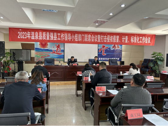 5月19日上午,温泉县召开2023年度质量强县工作领导小组部门联席会议暨打击侵权假冒、计量、标准化工作会议,18个质量强县领导小组成员单位参会,市监局党组书记吴宏波主持会议并讲话。