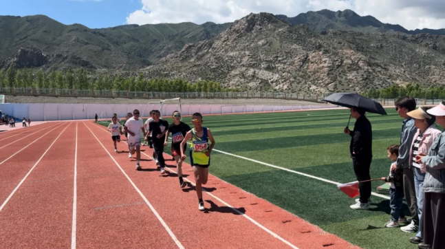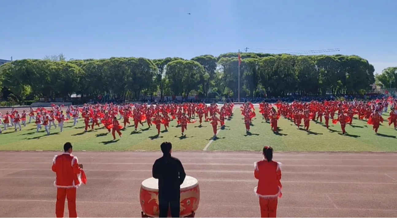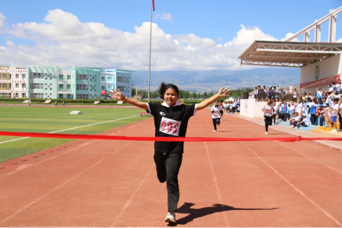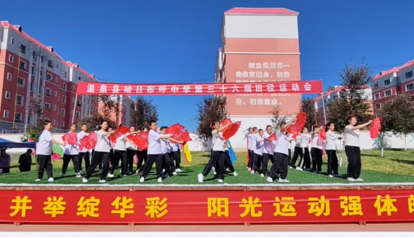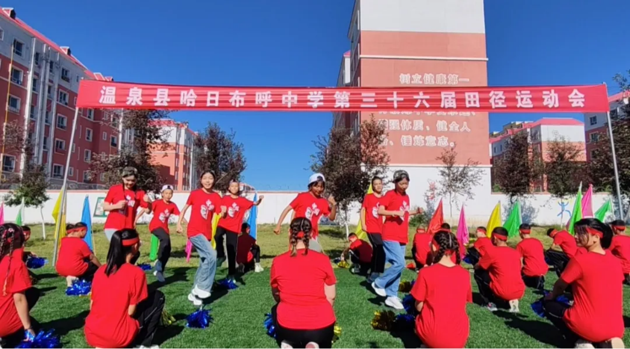 护旗队、彩旗队、裁判员方队……温泉县哈日布呼中学以班级为单位进行才艺展示,健美操、民族舞、扇子舞、国标舞、龙舞、足球操……踏着青春的舞步,释放青春的力量,学生观众的呐喊声、喝彩声、欢笑声此起彼伏。