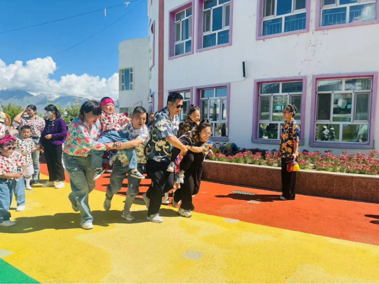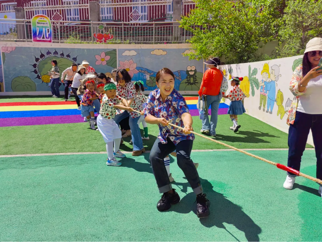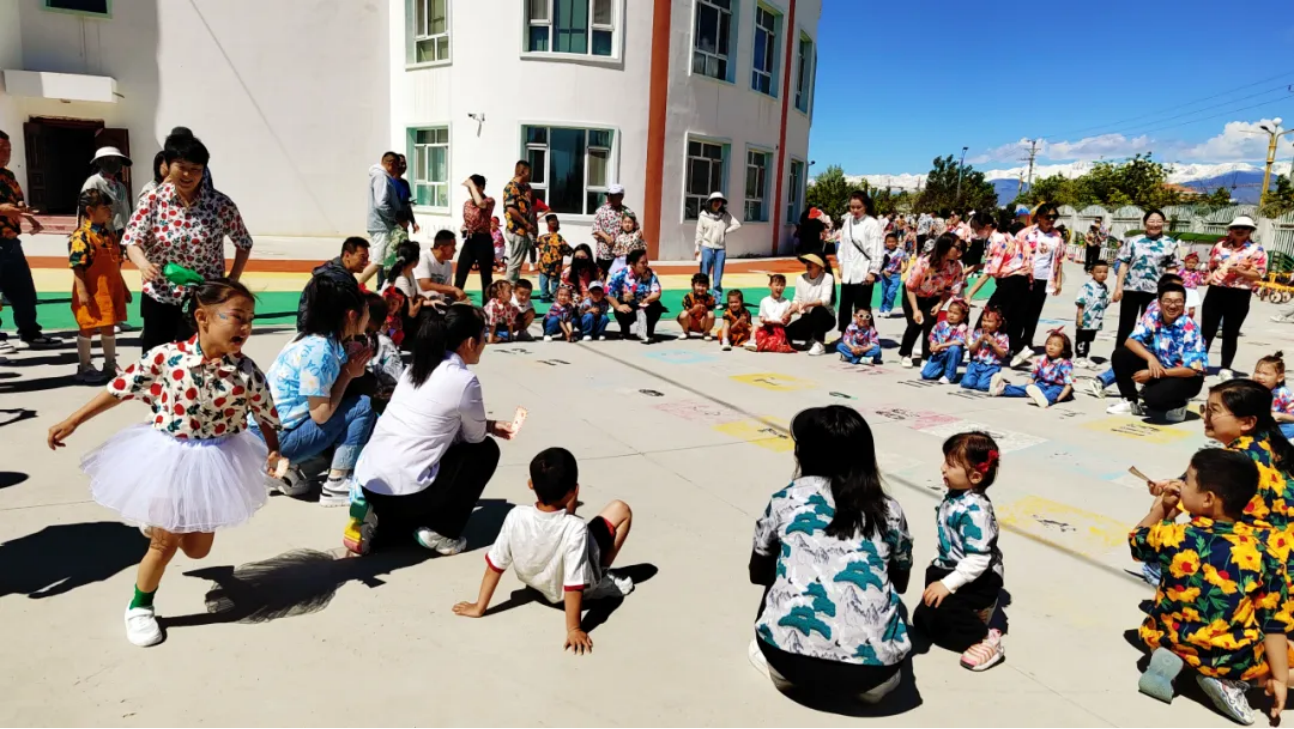 温泉县第一幼儿园开展“时光机·相约8090”亲子运动会。在老师的带领下,大家昂首阔步、英姿飒爽,踏着整齐划一的步伐,高喊振奋人心的口号入场,家长和幼儿一起穿越时光,回到8090年代,感受爸爸妈妈的童年,体验8090年代的游戏和童趣。跳皮筋、抓石子、丢手绢……大家玩得不亦乐乎。