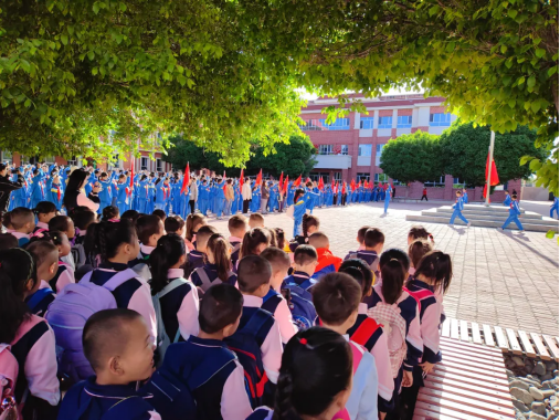 清晨,微风吹动着孩子们的好心情,他们精神抖擞地站在操场上,看到一个个戴着鲜艳红领巾的哥哥姐姐站在国旗下敬队礼时,平时活泼好动的孩子们一下子就安静下来,脸上也挂起了严肃的神情。