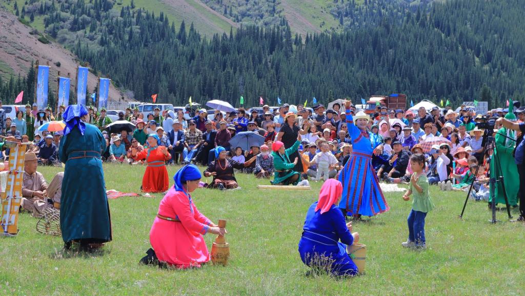 “咚咚锵,咚咚锵,咚咚咚咚锵……”在温泉县安格里格镇托斯呼尔图村夏季牧场的查干哈日嘎草原上,温泉县乌兰牧骑的演员正为各族群众倾情奉献一场文化盛宴。