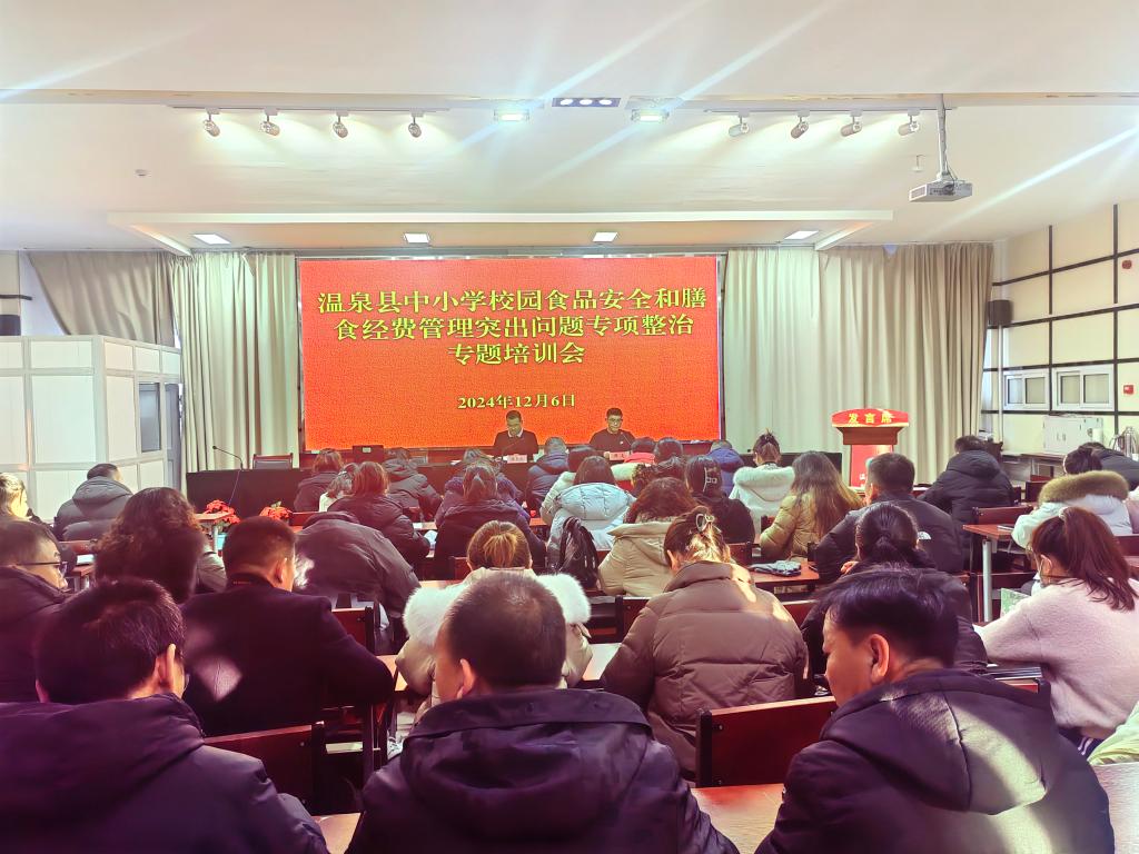 12月6日,温泉县中小学校园食品安全和膳食经费管理突出问题专项整治专题培训会在县教育局召开,县教育局党组副书记、局长肖贵芳出席会议,由副局长谭昊主持,各中小学幼儿园主要领导、学校食品安全总监和食品安全员等80余人参加。