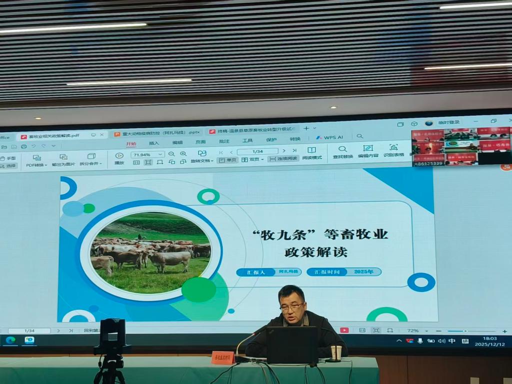 为持续提升领导干部服务经济高质量发展的能力水平,深入落实自治州“干部履职提升年”工作要求,12月12日,温泉县经济工作“每周讲堂”第十一讲在县总工会四楼会议室如期开讲。本期讲堂由温泉县农业农村局党组成员、畜牧兽医站站长阿扎玛提·吐日木进行专题授课,深入解读草原畜牧转型升级、重大动物疫病防控及畜牧业发展相关政策。讲堂旨在提升全县相关领域干部对畜牧业发展重点工作的认知与理解,凝聚推动产业高质量发展的合力。