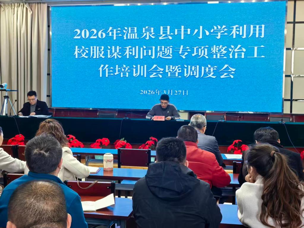为深入贯彻落实教育部关于全国中小学利用购买校服谋利问题专项整治工作部署,切实规范全县中小学校服采购管理工作,筑牢校园廉洁防线,维护学生及家长合法权益,3月27日,温泉县教育局组织各中小学主要负责人、校服采购工作负责人,集中参加自治区落实《教育部全国中小学利用购买校服谋利问题专项整治工作方案》部署会暨2026年全区利用购买校服谋利问题专项整治工作调度会。