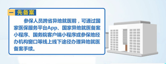 一是先备案。参保人员跨省异地就医前,可通过国家医保服务平台APP、国家异地就医备案小程序、国务院客户端小程序或参保地经办机构窗口等线上线下途径办理异地就医备案手续。