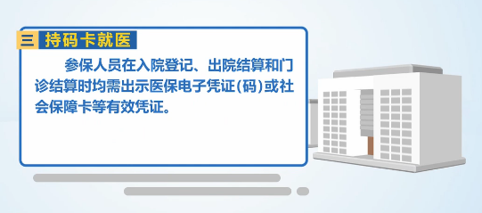 三是持码卡就医。参保人员在入院登记、出院结算和门诊结算时均需出示医保电子凭证或社会保障卡等有效凭证。跨省联网定点医药机构对符合就医地规定门(急)诊、住院患者,提供合理、规范的诊治及医疗费用的直接结算服务。
