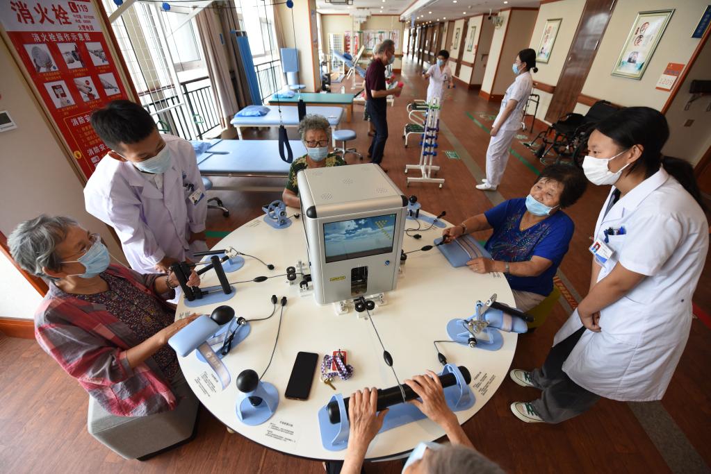 8月5日,在山东日照颐养公寓,医生指导老人通过手功能综合康复训练平台进行手指锻炼。新华社记者 范长国 摄