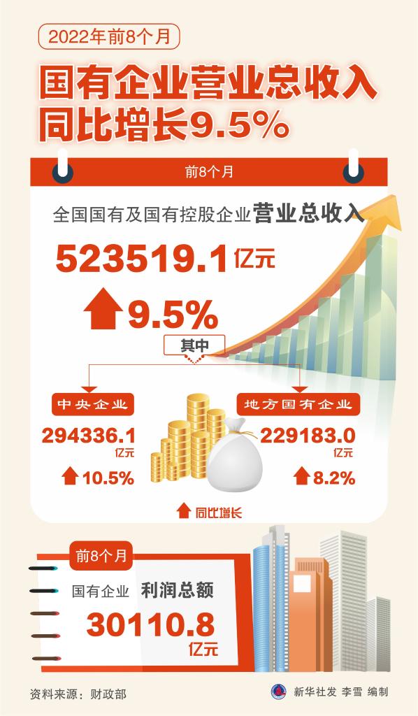 数据显示,今年前8个月,国有企业利润总额30110.8亿元,同比下降1.5%。国有企业应交税费40082.7亿元,同比增长13.8%。