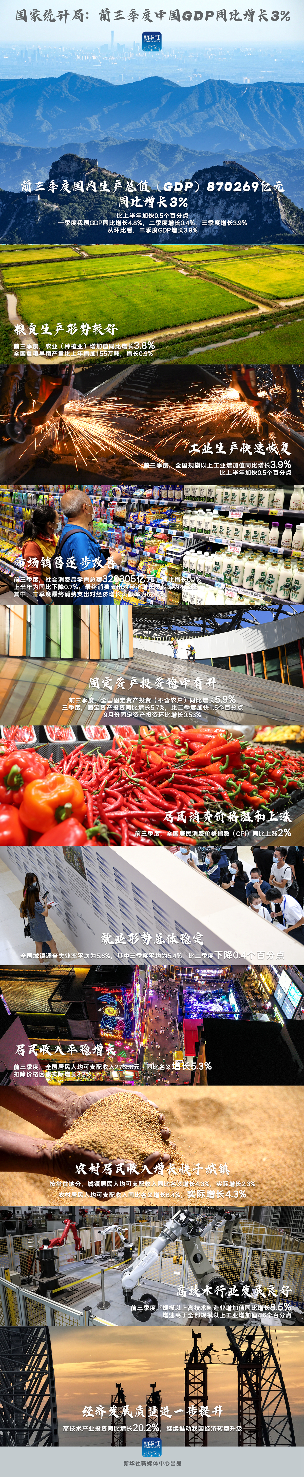 国家统计局日前发布数据,初步核算,前三季度国内生产总值(GDP)870269亿元,按不变价格计算,同比增长3%,比上半年加快0.5个百分点。