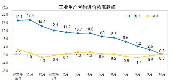 2022年10月份,全国工业生产者出厂价格同比下降1.3%,环比上涨0.2%;工业生产者购进价格同比上涨0.3%,环比上涨0.3%。1—10月平均,工业生产者出厂价格比去年同期上涨5.2%,工业生产者购进价格上涨7.5%。