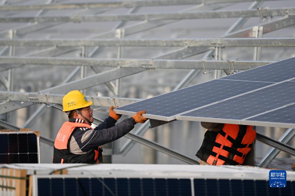 2023年1月5日,建设者在华电海晶光伏项目B标段施工。由中建三局总承包公司承建的天津华电海晶1000兆瓦“盐光互补”光伏发电项目建设稳步推进,项目预计在4月建成完工。新华社记者 李然 摄