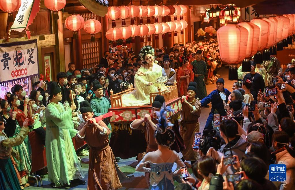 2022年12月31日,游客在陕西西安的长安十二时辰主题街区观看表演。新华社发(邹竞一 摄)