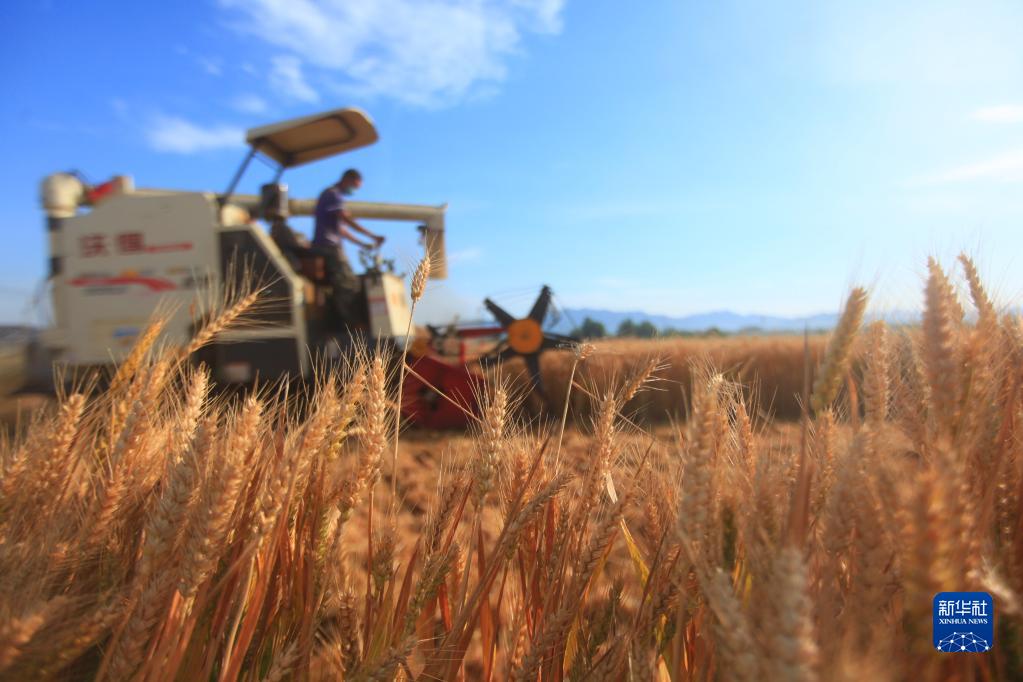 山东省临沂市平邑县农民驾驶收割机在田间收获小麦(2021年6月8日摄)。新华社发(武纪全摄)