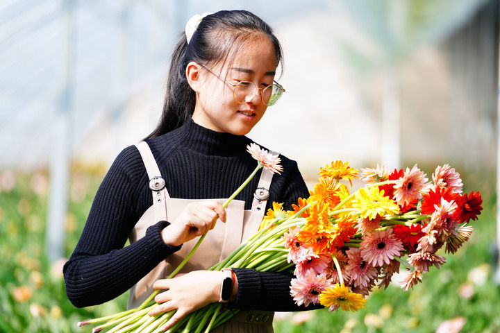 位于沂蒙革命老区的莒县招贤镇扶郎花生产基地,工作人员在整理扶郎花。