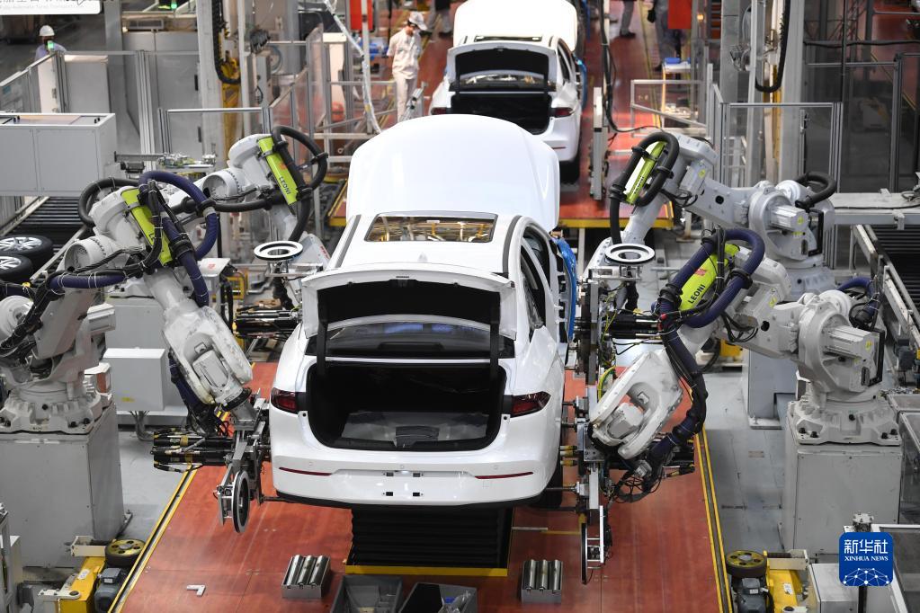 在广州市番禺区的广汽埃安新能源汽车股份有限公司总装生产线,机器人手臂在安装汽车轮胎(2023年2月24日摄)。新华社记者 邓华 摄