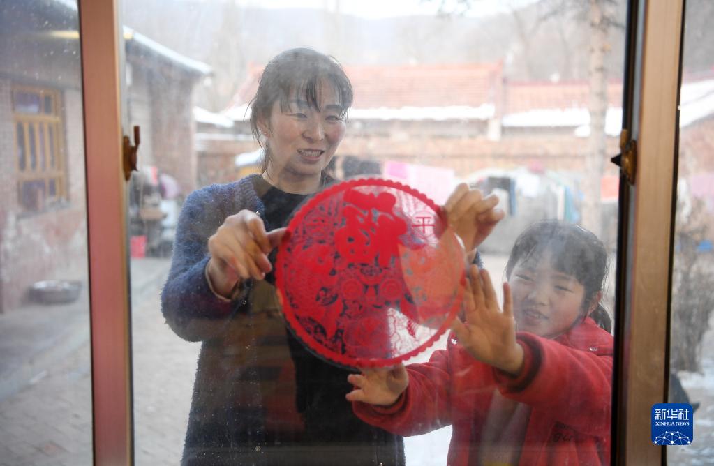 在位于大山深处的宁夏固原市隆德县凤岭乡于河村,村民马凤艳和女儿一起贴窗花(2022年1月28日摄)。近年来,在乡村振兴等战略助力下,于河村村容村貌发生巨大变化。新华社记者 王鹏 摄