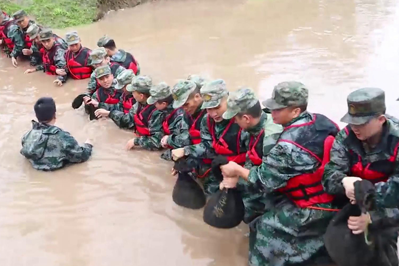 中部战区空军某部官兵在北京昌平区沙河镇搭设人墙(8月2日摄)。新华社发(舒永豪 摄)