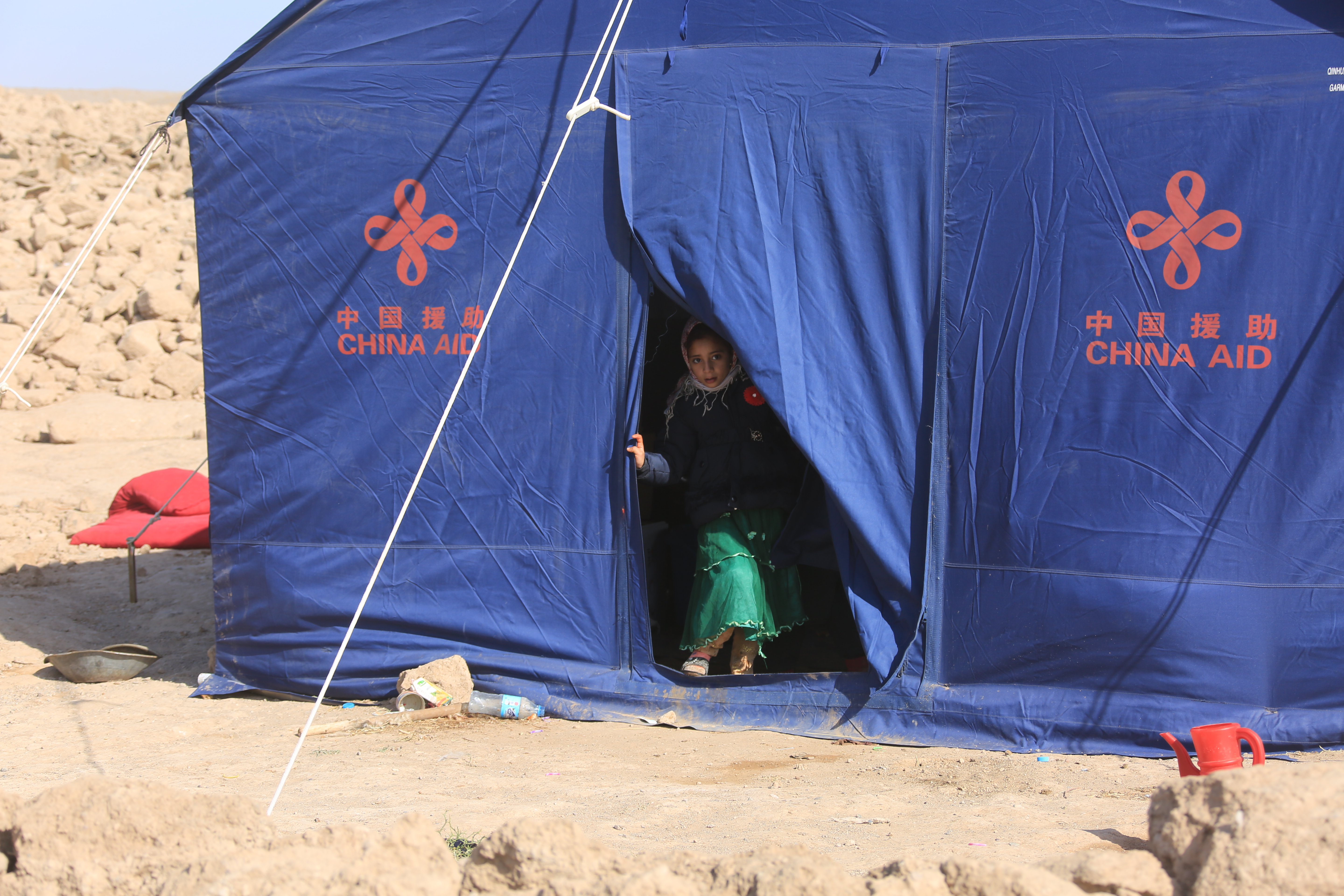 2023年10月16日,在阿富汗西北部赫拉特省津达詹地区,儿童站在中国援助的帐篷门口。新华社发(塞夫拉赫曼·萨菲摄)