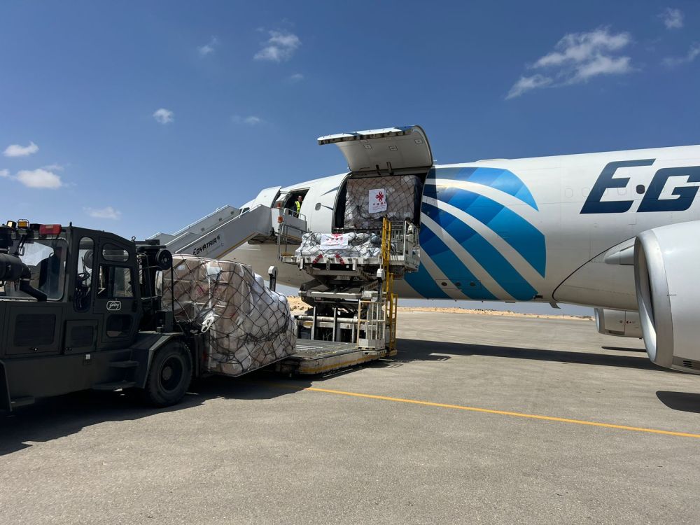 2024年4月19日,工作人员在埃及阿里什机场卸载中国援助巴勒斯坦的物资。新华社发