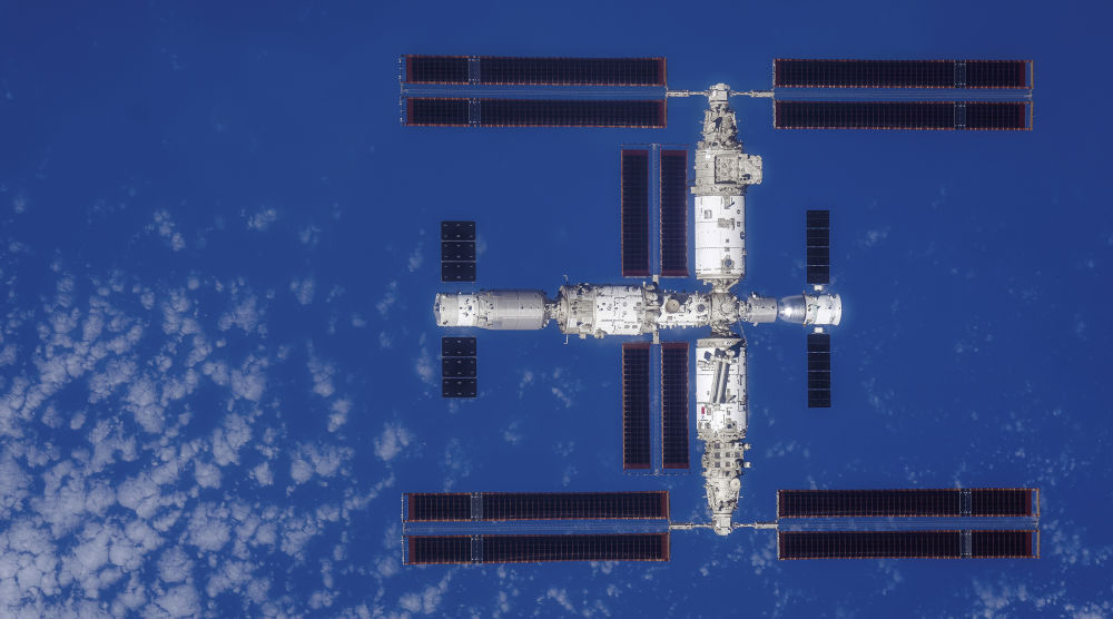 2023年11月28日,中国载人航天工程首次对外发布由神舟十六号乘组返回地面前手持高清相机,通过飞船绕飞拍摄的空间站组合体全景照片。这是我国首次在轨获取以地球为背景的空间站组合体全貌图像,也是中国空间站的第一组全构型工作照。新华社发(中国载人航天工程办公室供图)