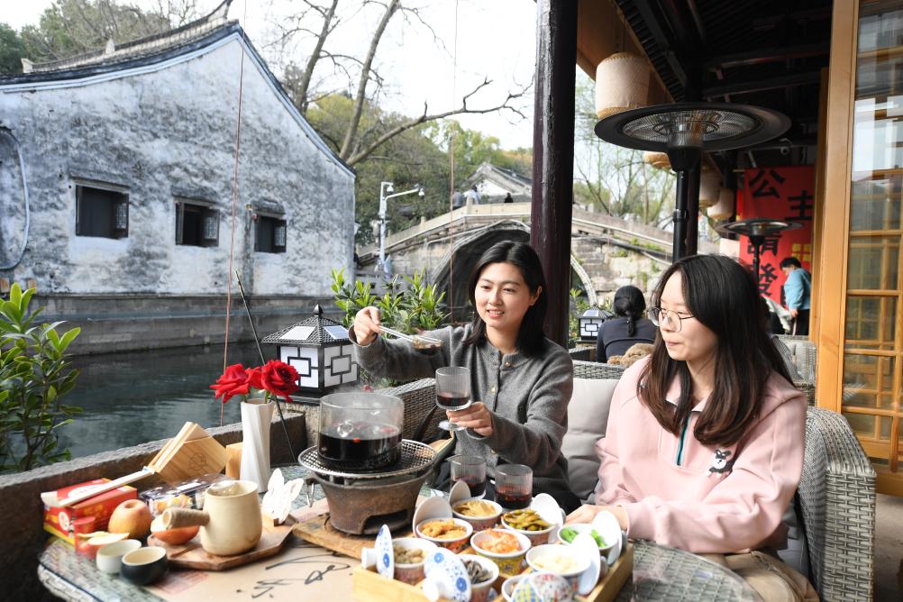 3月13日,人们在浙江绍兴市仓桥直街的一家店铺围着炉火消费、休闲。新华社记者 翁忻旸 摄