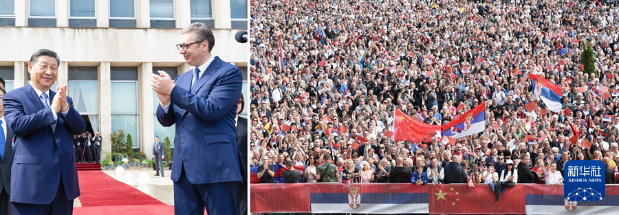 当地时间5月8日上午,国家主席习近平在贝尔格莱德塞尔维亚大厦同塞尔维亚总统武契奇举行会谈。会谈前,武契奇陪同习近平来到政府大厦平台(左图)。大厦广场上,一万五千名塞尔维亚民众挥舞中塞两国国旗,对习近平表示最热烈的欢迎(右图)。(拼版照片)新华社记者 黄敬文 丁海涛 摄
