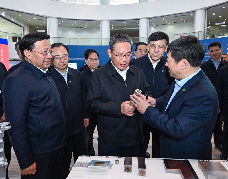 5月10日,中共中央政治局常委、国务院总理李强在安徽调研。这是李强在中国科学技术大学先进技术研究院听取科技创新及成果转化情况汇报,参观科研设备和技术产品展示。新华社记者 饶爱民 摄