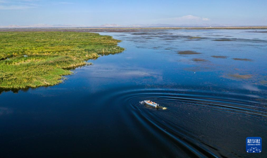 在内蒙古乌梁素海湖面上,河湖湿地水环境保护与修复技术研究团队成员乘坐快艇去采集湖水样本(2023年9月15日摄,无人机照片)。新华社记者 连振 摄