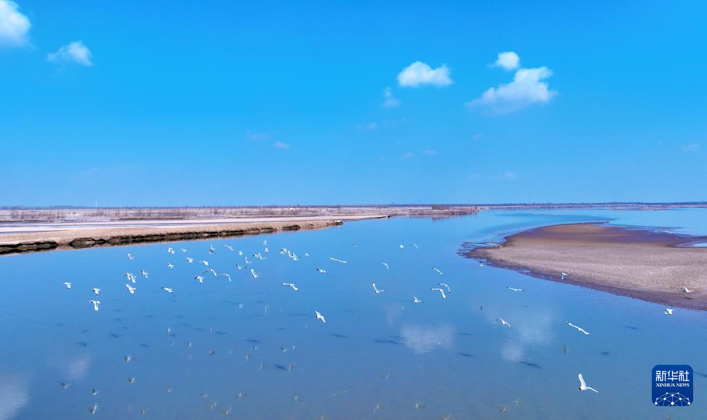 在黄河宁夏段,候鸟在滩涂上空飞翔(2024年3月1日摄,无人机照片)。新华社记者 王鹏 摄