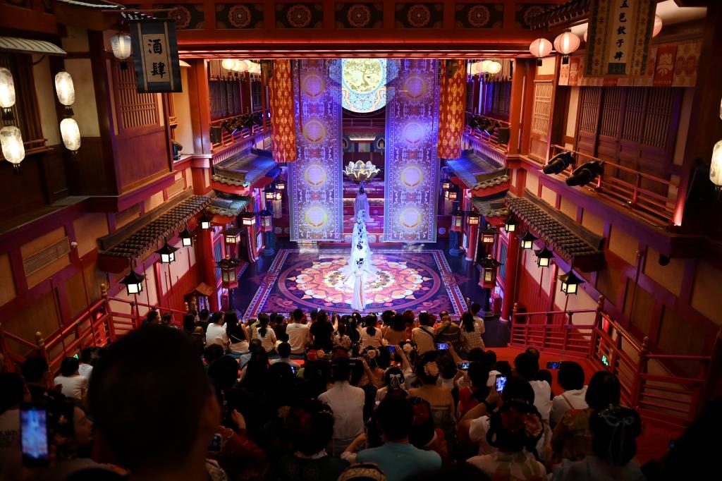 2024年5月12日,游客在西安长安十二时辰主题街区内观看演出。新华社记者 李一博 摄