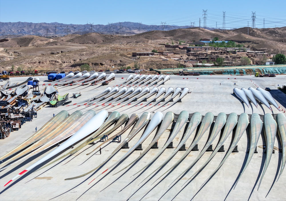 2024年5月11日拍摄的码放在内蒙古包头市石拐区一家风电设备制造企业厂区内的叶片(无人机照片)。新华社记者 连振 摄