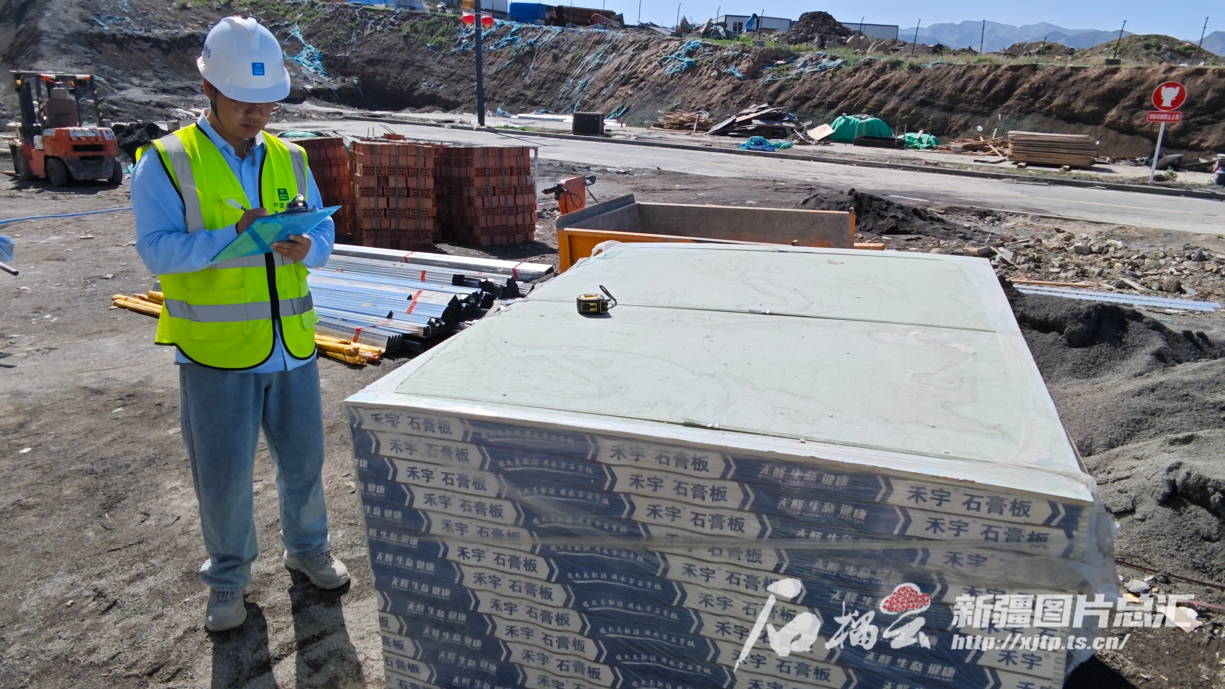 5月22日,在乌鲁木齐市东大梁科技创新产业园及基础设施配套建设工程项目工地上,李孟洋正在核对物资清单。孙同文摄