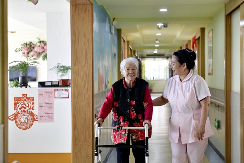 2024年5月25日,在山东省日照市东港区石臼街道日照幸福护理院,工作人员在陪护老人。新华社记者 郭绪雷 摄