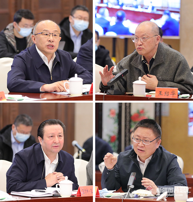 于爱平、王绍华、亚力坤·亚库甫、李继林(从左至右、从上至下依次排序)分别介绍我区防控措施落实、机制完善、应急预案优化等情况,并就做好下一步疫情防控工作提出意见建议。记者 崔志坚摄