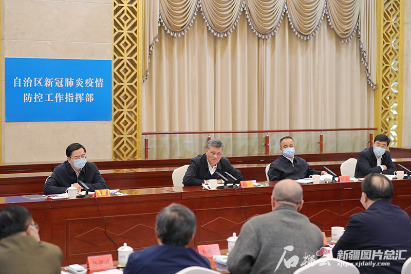 3月16日,自治区党委书记、自治区新冠肺炎疫情防控工作领导小组组长马兴瑞,自治区党委副书记、自治区主席、自治区新冠肺炎疫情防控工作领导小组副组长艾尔肯·吐尼亚孜等领导认真听取全区疫情防控工作汇报。记者 崔志坚摄