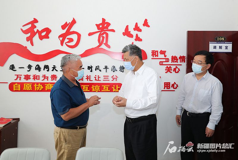 5月17日,自治区党委书记马兴瑞在和硕县特吾里克镇同人民调解员交谈交流,了解社会矛盾纠纷多元预防调处化解综合机制。天山网-新疆日报记者 崔志坚摄