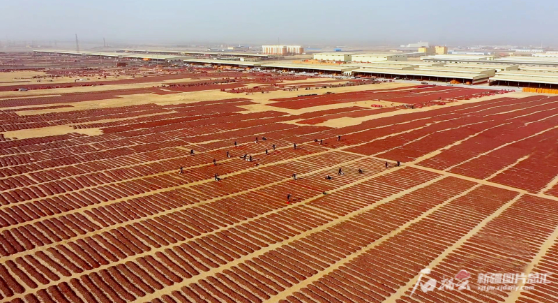 位于和田县布扎克乡的新疆果业集团新疆红枣(和田)批发交易市场是集红枣晾晒、交易、加工和仓储于一体的新型农产品交易集散中心,年交易红枣20万吨以上(2019年11月5日无人机拍摄)。图由新疆果业集团提供(资料图片)
