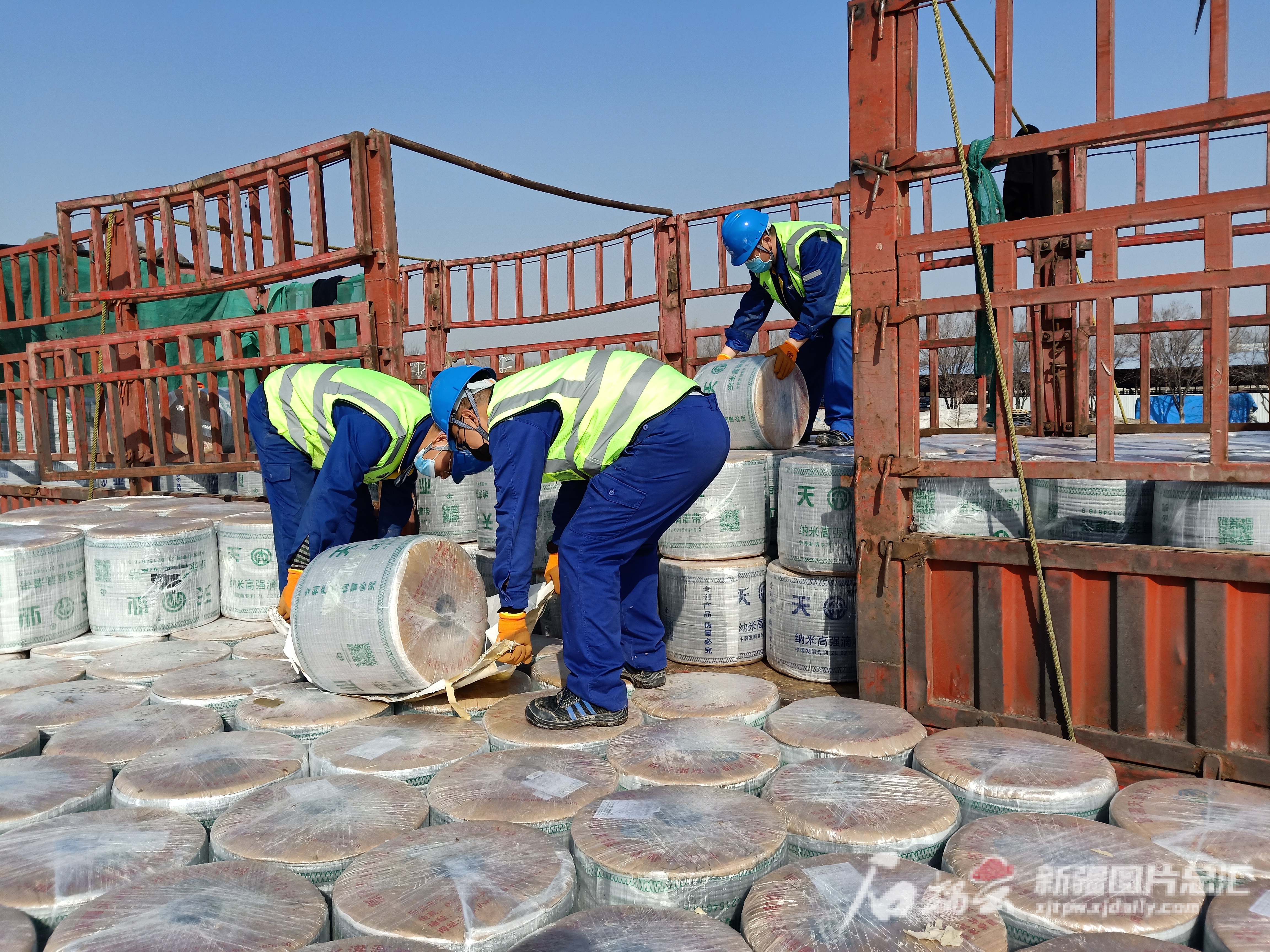 2月20日,新疆天业节水灌溉股份有限公司工人对滴灌带进行打包装车。樊宏图摄