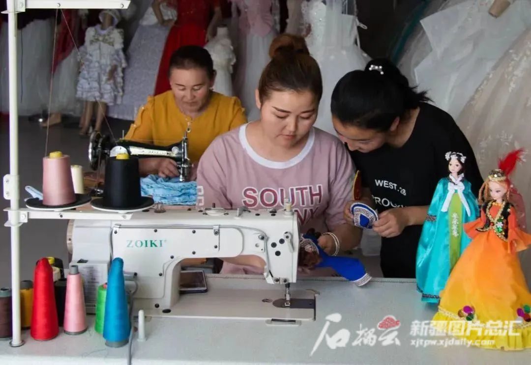 阿勒泰地区青河县“织女手工艺品农民专业合作社”负责人库丽巴扎尔·热合买多拉(左二)教授妇女群众制作河狸玩偶。自治区妇联供图