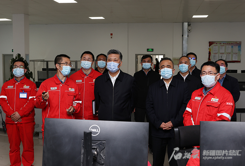 3月18日,自治区党委书记马兴瑞来到阿克苏地区调研。自治区党委副书记、自治区主席艾尔肯·吐尼亚孜一同调研。这是马兴瑞、艾尔肯·吐尼亚孜在中国石油塔里木油田哈得采油气管理区富源油气运维中心,听取油气处理、管理维护等工作情况介绍。杨硕摄