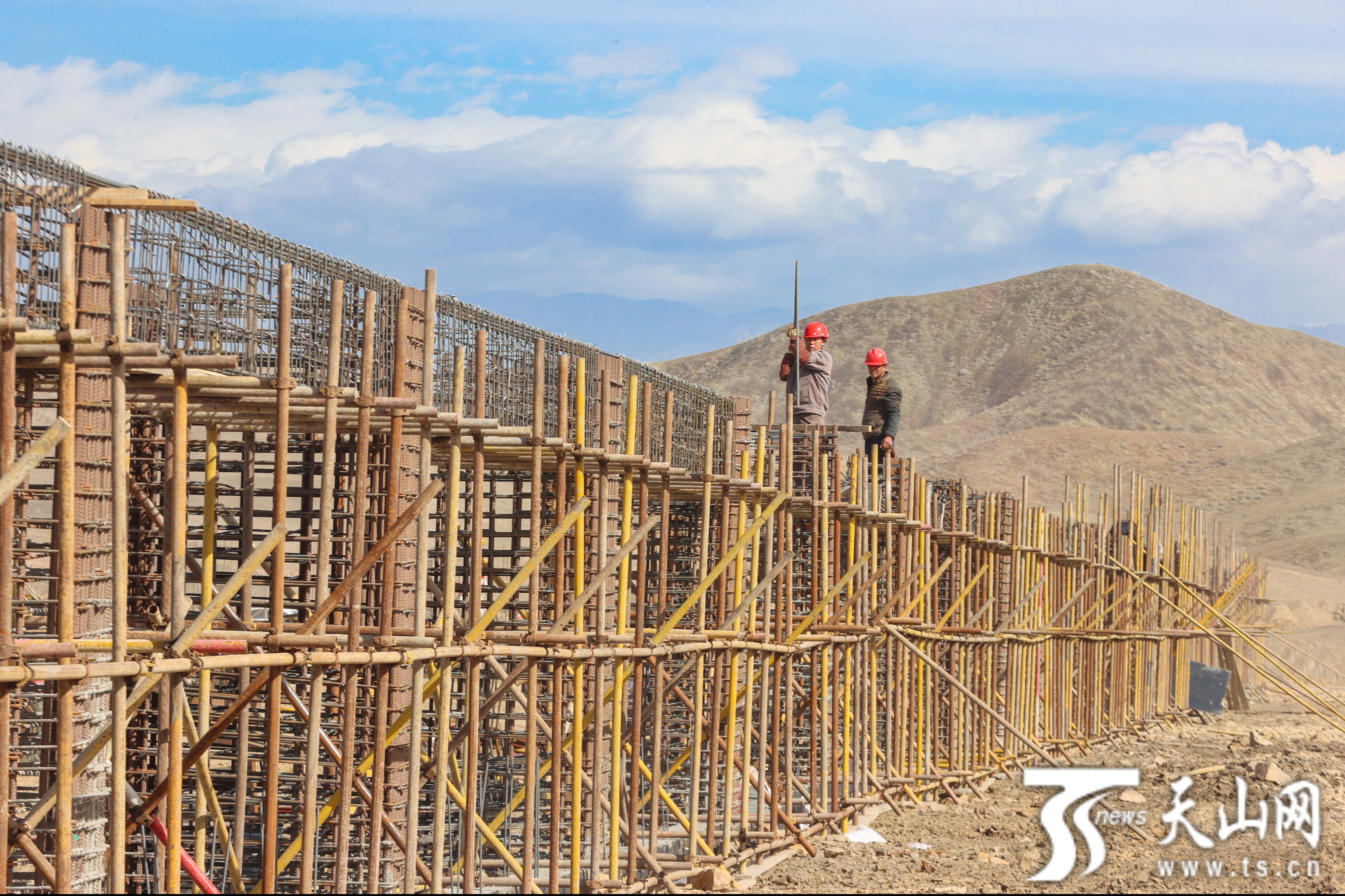 4月11日,施工人员在博乐市五台储煤中心项目建设现场作业。该项目计划建设5座总储备量60万吨的全封闭式储煤库,预计今年8月投入使用。项目建成后,将有效解决零散运输成本高、供应不及时等问题,保障当地煤炭供应。 楠登摄