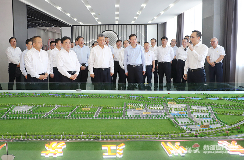 8月4日,马兴瑞、信长星、许昆林、艾尔肯·吐尼亚孜等,在位于克孜勒苏柯尔克孜自治州的克州江苏产业园听取园区建设和对口支援情况介绍。天山网-新疆日报记者 崔志坚摄