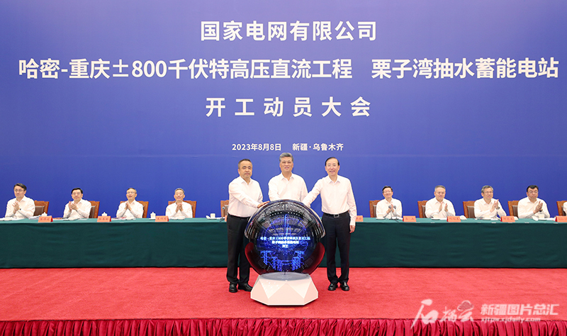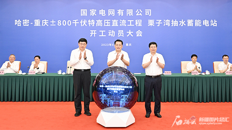 天山网-新疆日报讯(记者王兴瑞报道)8月8日上午,国家电网有限公司在新疆和重庆同步举行哈密—重庆±800千伏特高压直流工程和栗子湾抽水蓄能电站开工动员大会,标志着“疆电外送”第三通道建设正式启动。自治区党委书记马兴瑞、重庆市委书记袁家军和国家电网有限公司董事长辛保安、国家能源局副局长余兵出席会议并讲话。