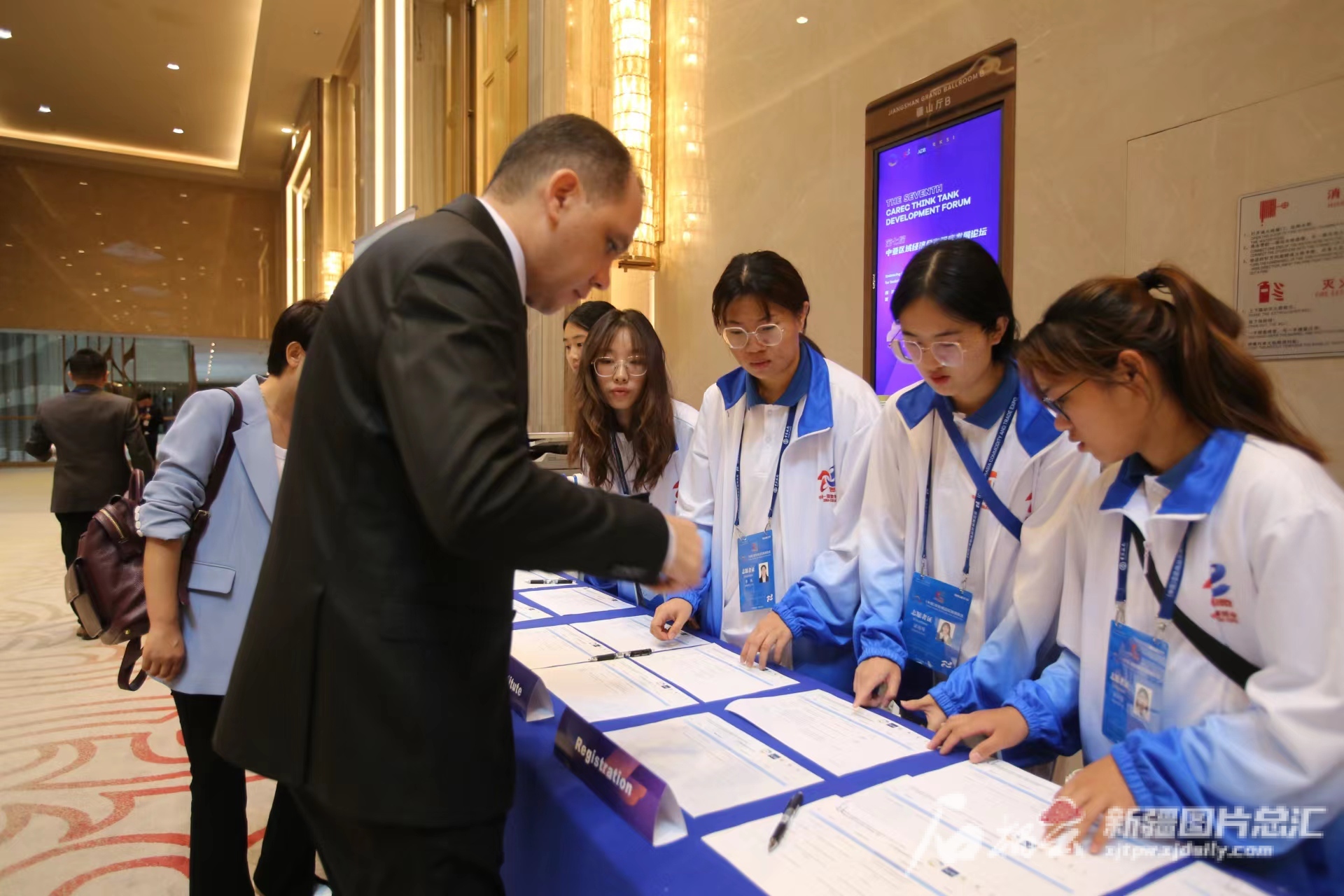 8月16日,参加第七届中亚区域经济合作智库发展论坛的代表在咨询论坛相关情况。