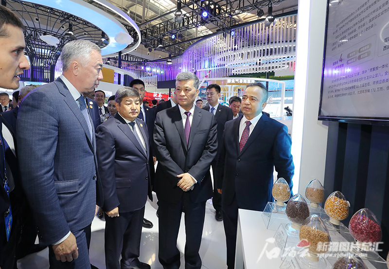 开幕式前,吉尔吉斯斯坦总理阿·扎帕罗夫,哈萨克斯坦副总理兼贸易和一体化部部长茹曼加林,自治区党委书记马兴瑞,自治区党委副书记、自治区主席艾尔肯·吐尼亚孜等外国嘉宾、自治区领导和部分嘉宾共同巡视展馆。这是阿·扎帕罗夫、茹曼加林、马兴瑞、艾尔肯·吐尼亚孜等在昌吉回族自治州展区了解新疆种业发展情况。天山网-新疆日报记者 周鹏摄