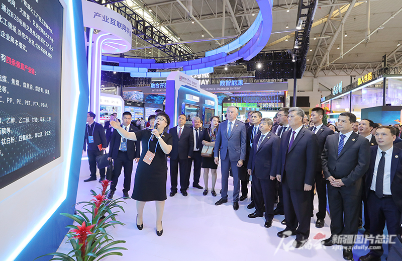 开幕式前,吉尔吉斯斯坦总理阿·扎帕罗夫,哈萨克斯坦副总理兼贸易和一体化部部长茹曼加林,自治区党委书记马兴瑞,自治区党委副书记、自治区主席艾尔肯·吐尼亚孜等外国嘉宾、自治区领导和部分嘉宾共同巡视展馆。这是阿·扎帕罗夫、茹曼加林、马兴瑞、艾尔肯·吐尼亚孜等在新疆能化网平台展位前了解产业互联网平台建设和发展情况。天山网-新疆日报记者 周鹏摄