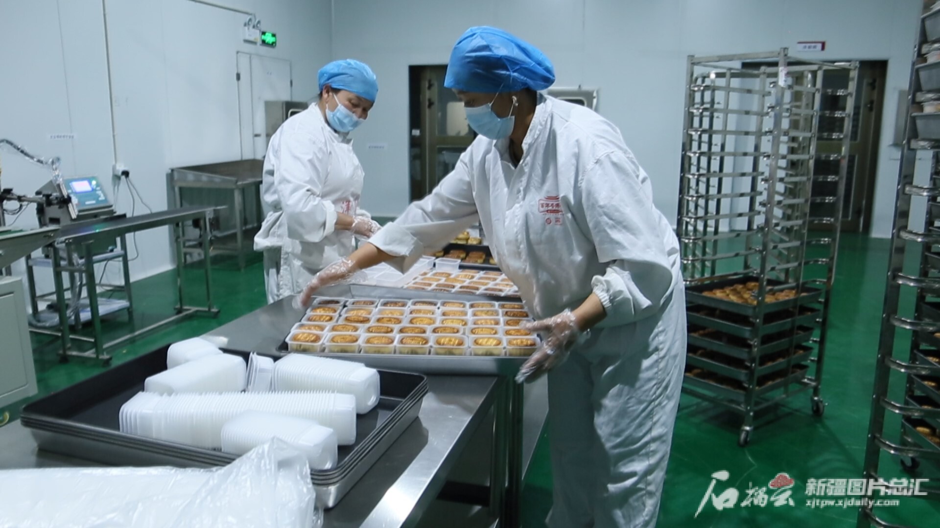 9月4日,哈密市巴里坤哈萨克自治县花园乡花庄子村新疆晋阳豫食品有限公司生产车间内,员工正在生产月饼。“晋阳豫”食品是河南省开封市的百年老字号,该公司由河南产业援疆项目引进成立。胡尔曼别克摄