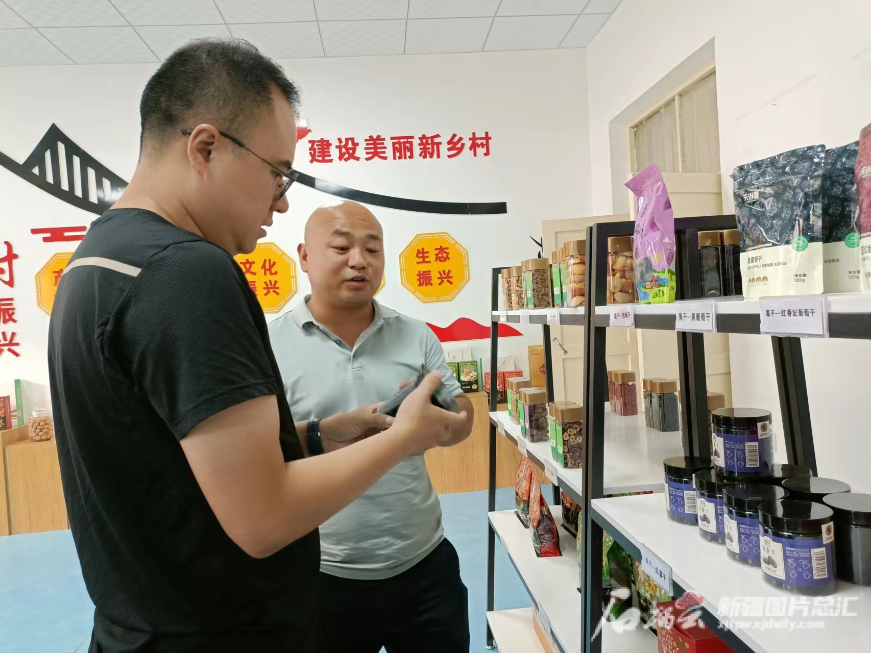 9月3日,浙江省丽水市产业援疆企业——新和县新疆丽耕农业科技发展有限责任公司负责人(右)与援疆干部在交流新和县特色农产品深加工及销售情况。邹婧 摄