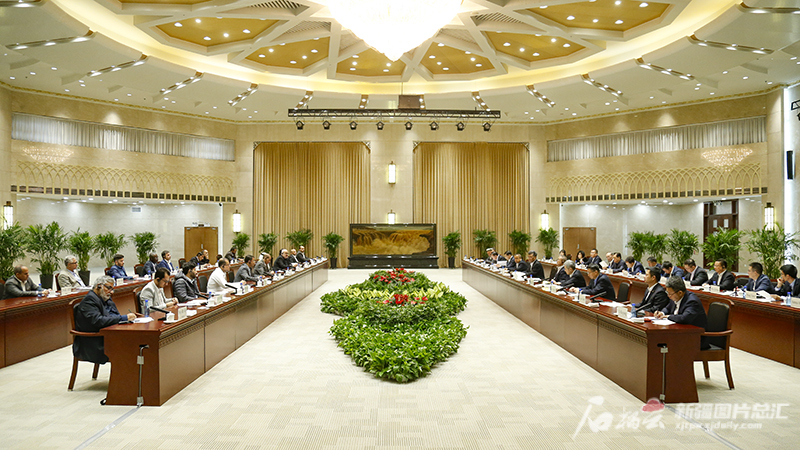 11月1日,自治区党委书记马兴瑞、自治区主席艾尔肯·吐尼亚孜在乌鲁木齐会见来新疆参访的西亚和北非国家宗教界和媒体人士代表团一行。天山网-新疆日报记者 谢龙摄